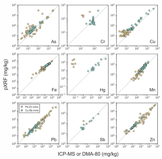 - Copper (Cu): comparability of pXRF with ICP-MS results was strongly dependent on the element concentration and acceptable for Cu > 100 mg/kg, whereas below such values, Cu concentrations detected via pXRF were false;