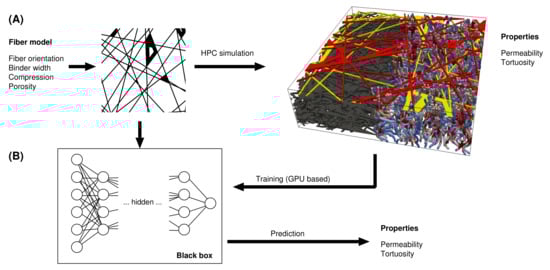 This study investigates the permeability of fiber-based GDLs. The permeabilities of micro-structures generated from a stochastic geometry model were determined in previous LB simulations [9], as depicted in Figure 1. Not only the arrangement of fibers but also the distribution of binders was varied. Furthermore, the underlying micro-structures were compressed. The set of simulation results were then used to train a CNN to predict permeability from the image series. In a similar way, Cawte and Bazylak [32] developed a CNN for the prediction of GDL permeability, with its data generated by pore network modeling (PNM). The relevance of the GDL characteristics as a function of binder and compression was recently analyzed by Wang et al. [33].