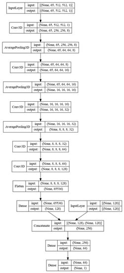 The architecture is illustrated in Figure 2. The main input layer is shown on the left-hand side, with the hidden layers attached from left to right. Noticeable layers in Figure 2 include the three-dimensional convolutional layers, marked as Conv3D. The shape of the structures is written on the right of the Conv3D boxes, after the keyword ‘None’. The dimensions begin with 65 × 512 × 512 and one filter from the input layer, after which the dimensions are reduced stepwise down to 8 × 8 × 8, while the number of filters is doubled from one Conv3D layer to its successor. The functional concatenation with the compression level as a second input layer is also embedded in the bottom part of the visualization. The compression level is extended to an array size of 128 to allow matching with the output of the dense layer.