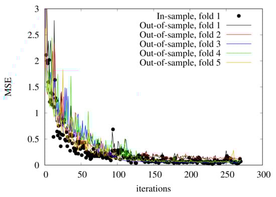 The MSE (Equation (1)) was evaluated for the training data, also referred to as the in-sample MSE or training error rate [35]. With long training, there is a risk that the CNN becomes too specialized for the particular training data. It may occur that the MSE, achieved using never-seen data, is worse than the in-sample MSE. Such an effect is referred to as overfitting and can be identified by comparing the in-sample and out-of-sample MSEs. Overfitting would be indicated by a local minimum of the out-of-sample MSE along the training steps. Figure 6 shows the out-of-sample MSE for the five folds. Both the in-sample MSE and out-of-sample MSE are decreasing. For better visibility, the in-sample MSE is only displayed for one fold. The progress of the out-of-sample MSE demonstrates that no overfitting was observed during training. The MSE of fold no. 2 is larger than the others (Table 1). This is also reflected by the red line in Figure 6, specifying the development of the MSE in the five folds: this curve is slightly higher than the others. On the other hand, a peak at the end of the training is shown by folds 4 and 5. Such effects were overcome using the early stopping method during training.