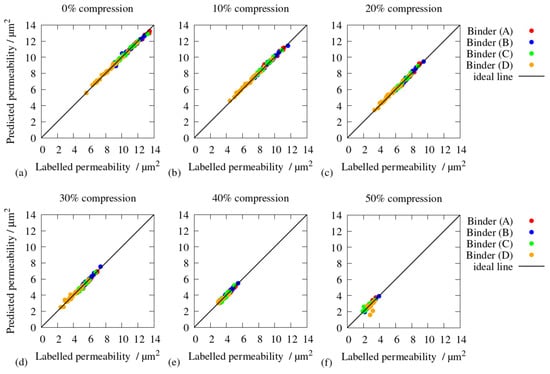 Figure 7 displays the accuracy of the permeabilities predicted by the CNN on the training and validation data, separated by the compression level. The predicted values (the y-axis in the diagrams) are compared with the correct values previously calculated using LB simulations. In addition, the values are colored according to the binder model. Although this feature was not entered into the CNN, the clusters are represented by the ML model, as they were already previously identified by Froning et al. [9]. Along with higher grades of compression, the permeabilities decrease, which is in accordance with Tomadakis et al. [13], our previous investigations [9], and the experimental results of Feser et al. [44] and Hoppe [45]. As proposed by Froning et al. [9], the compressed data exhibit systematically lower permeabilities than the uncompressed data. Nevertheless, Froning et al. [9] state that the binder model with br = 18 µm is the most realistic one compared with the real material. In particular, the high compression level of 50% exhibits a lower degree of accuracy than the others. On the other hand, the high compression levels suffer from inaccuracies as a result of how they were constructed. The most inaccurate data, with 50% compression, were also found to be unrealistic in previous investigations [9].