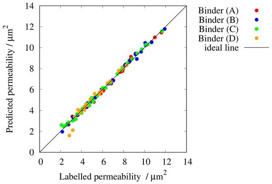 Figure 8 shows the accuracy of the CNN predictions applied to the validation data, colored according to the binder model. The diagram illustrates that the prediction by the CNN is best for the binder models with br ≤ 30 µm, which are more realistic than the other two variants [9]. The parameter for the binder width was originally introduced by Thiedmann et al. [38] to model the distribution of the binder along the fibers of the GDL. They presented variant as an extreme case. This is illustrated in Figure 3D, in which polygons built by fibers were fully filled with binder material. Due to the stochastic nature of the fiber arrangement, such areas can be large, as in Figure 5D. In these cases, the gas flow would be dramatically inhibited, causing a different flow behavior than in micro-structures with limited binder widths.