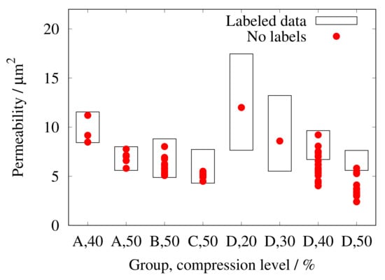 As noted in Section 2.4, only 541 simulations of the 600 available data-sets led to a physically consistent result. The permeabilities of the micro-structures of the other 59 virtual geometries were predicted by the ML model. Figure 9 displays the groups of the binder model (Figure 3) and compression level. The minimum and maximum values of the LB simulations within the particular groups of data are shown as boxes. Each group of data consists of 25 image series, with numbers of unlabeled data in the groups as follows: three in group A, 40%; five in group A, 50%; eleven in group B, 50%; seven in group C, 50%; one in group D, 20%; one in group D, 30%; eighteen in group D, 40%; and thirteen in group D, 50%. In most of the groups, the predicted permeability of unlabeled micro-structures was within the range of permeabilities calculated earlier by the LB simulation, except for groups D, with 40% and 50%. The latter group suffers from having only being subject to a few successful simulations by Froning et al. [9]. The wider range of predicted permeabilities results from the small amount of labeled data in these two groups. This indicates that the CNN is able to predict consistent permeability values for micro-structures that are not eligible for LB simulations as soon as the material is within the feature range of the training data. In a similar manner, Yuan et al. [25] filled missing positions in their membrane database with ML-predicted values.