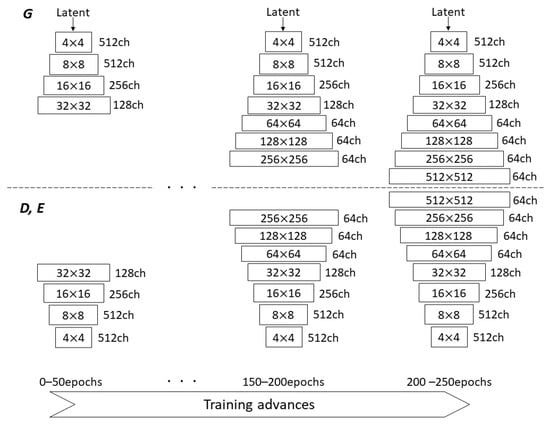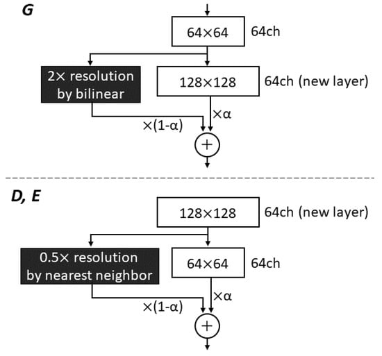 We incorporated a technique for gradually increasing the image resolution in the networks, as proposed for PG-GAN by Karras et al. [23]. They started training with 4 × 4 low-resolution images, and added new layers to progressively increase the resolution in both G and D. This approach permits the networks to first obtain large-scale image features, followed by directing attention to increasingly finer scale features. The authors also used WGAN-GP loss as one of the loss functions. Eventually, PG-GAN was used to produce 1024 × 1024 images with convincing realism. The progressive growing (PG) technique can offer more stable and faster training, compared with simultaneously learning all scales. Utilizing this technique for not only G and D, but also E in CR-GAN, we attempted to increase the generated image resolution to 512 × 512 starting from 32 × 32, as shown in Figure 2. We added a new layer to each network per 50 training epochs, in order to increase the generated image resolution. When inserting the new layer into G, we doubled the resolution of the previous layer using bilinear interpolation, thus matching the resolution of the new layer. Next, the up-sampled feature vector from the last layer and the vector from the new layer were summed with weights (1-) and , respectively, where increases linearly from 0 to 1 each 50 epochs as the training progresses (see Figure 3). Similarly, when an image with doubled resolution is newly fed into D and E, the feature vector from the new layer is down-scaled using the nearest neighbor method, in order to ensure that the same resolution is preserved between layers. The down-scaled vector and the vector from the next layer are also combined through weighted summation. In the original work on PG-GAN, the resolution was transited in the three channels of RGB colors [23]; however, except in the case of 32 × 32 resolution with 128 channels, we operate the resolution transition in 64 channels, in order to reduce the load on the GPU by making the network layers as shallow as possible.