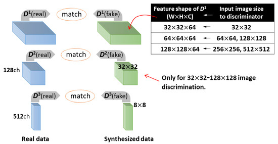 Calculation of feature matching loss () using feature vectors from middle layers of the discriminator. When an image with a resolution ranging from 32 × 32 to 128 × 128 is input into the discriminator, three feature vectors (, , ) are used to calculate . The shape of depends on the input image size. When a 256 × 256 or 512 × 512 image is input into the discriminator, is calculated from two vectors with shape 128 × 128 × 64 and 8 × 8 × 512, respectively.