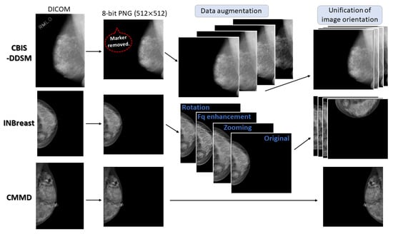 The DICOM data from the above three databases were converted into 8-bit portable network graphics (PNG) format images. All the image sizes were reduced to 512 × 512 by bilinear interpolation. We replaced tiny artifacts, such as dust particles, with the surrounding pixels. As most CBIS-DDSM images include X-ray markers indicating anatomical sides and view directions (e.g., “R-MLO”), the image pixels on the markers were replaced with a pixel value of 0. Figure 5 depicts the pre-processing flow.