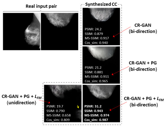 Comparison of synthesized CC views at 256 × 256 resolution by training methods. Examples chosen of a successful case using bi-directional training with PG technique and feature matching loss. The yellow arrows indicate artifacts outside the breast.