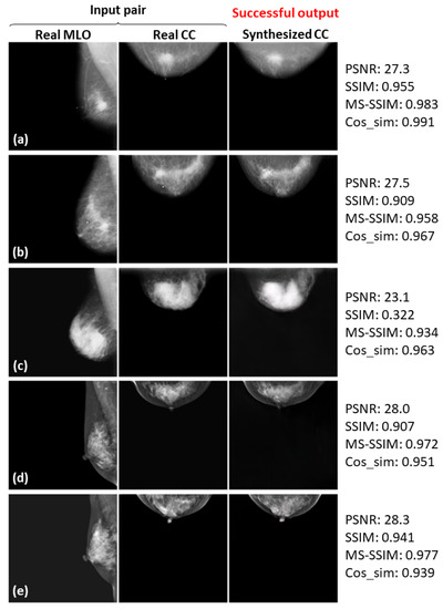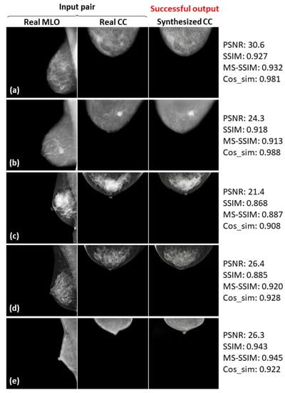 Five successful examples (a–e) of the real input paired and synthesized CC-view mammograms at 256 × 256 resolution by bi-directional training of CR-GAN incorporating PG technique and feature matching loss.