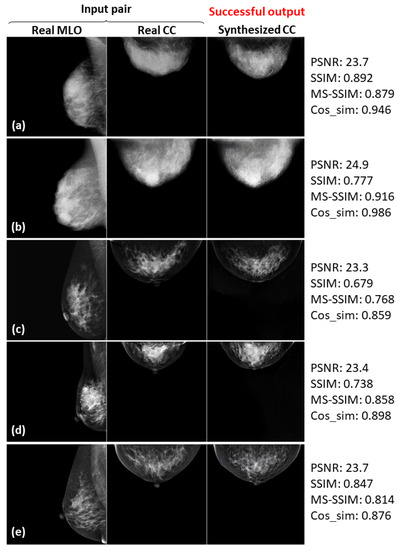 Here, we again define successful cases, where the synthesized CC views look quite similar to the real ones. Figure 8, Figure 9 and Figure 10 show the successful examples at 128 × 128, 256 × 256, and 512 × 512 resolutions, respectively, using the method incorporating the PG technique and . The calculated similarity metrics are presented in the right columns. Further examples of relatively successful cases are shown in Figure A1–Figure A3 in the Appendix A. In contrast, examples, in which the real and synthesized CC views do not resemble each other, are defined as failed cases. Figure 11, Figure 12 and Figure 13 show the examples of failure at each resolution when using the method incorporating PG technique and . The authors, who are radiological technologists with more than 10 years of experience, judged whether the synthesized images belong to the successful or failed cases. A.Y. is also a mammography technologist certified by the Japan Central Organization on Quality Assurance of Breast Cancer Screening. The judgment was conducted by comparing the shape of the breast, the mammary-gland density and structure, the shape and size of the lesion, and other clinically important factors between the real and synthesized views. For instance, the synthesized view in which the mammary-gland density differs from the real view, or in which the tumor that should be there is missing, were included in the failed cases.