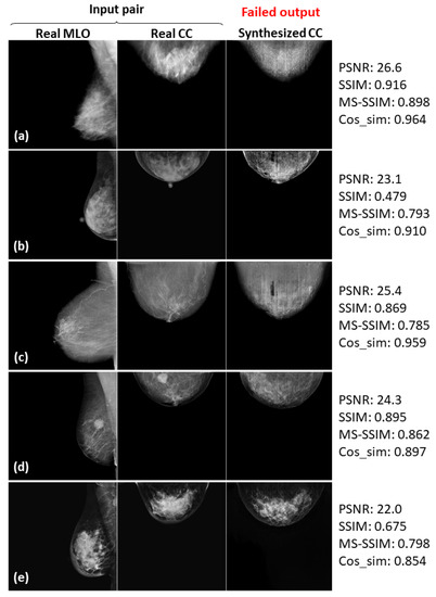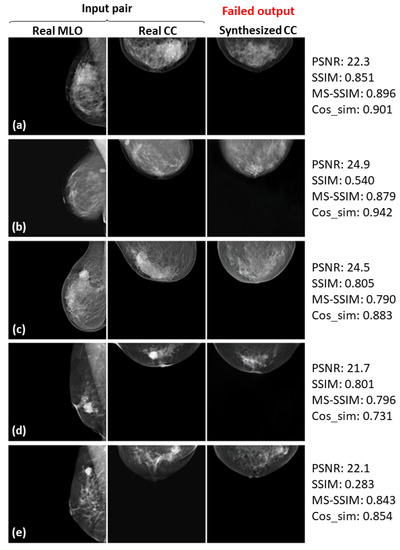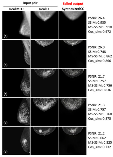 Five failed examples (a–e) of the real input paired and synthesized CC-view mammograms at 256 × 256 resolution by bi-directional training of CR-GAN incorporating PG technique and feature matching loss.
