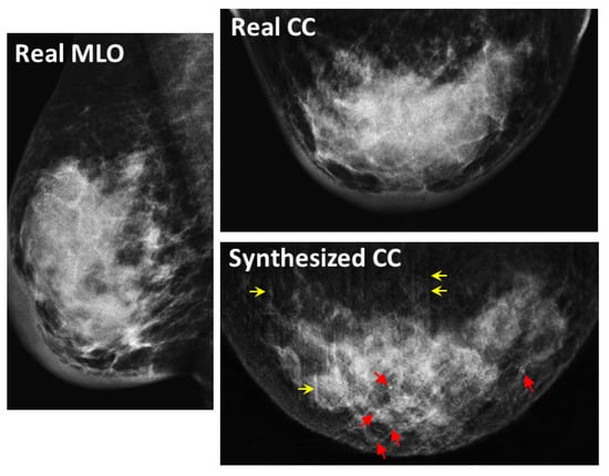 We consider the insufficient volume of training data and the restricted batch sizes as reasonable causes of synthesis failure. In Figure 15, it can also be seen that the artifacts were more noticeable and the image quality was degraded with lower batch size. According to [48], Tian et al. have successfully generated multi-view face images using labeled images of at least 200 subjects from Multi-PIE and 72,000 unlabeled images from CelebA [49] by CR-GAN with a batch size of 64. The number and variation of our used training data, consisting of images from approximately 3000 subjects, would surely have been too small to cover the whole latent space. Korkinof et al. [26] have synthesized realistic high-resolution mammograms at 1280 × 1240 resolution by PG-GAN using eight GPUs each with 16 GB memory. Although their used batch size was not specified, it is expected that they used batch sizes higher than 4, which was the available maximum batch size for the 512 × 512 image syntheses in our training environment using only one 16 GB GPU. In fact, the models without using a batch size of 4 failed to synthesize 256 × 256 images, due to the divergence of discriminator and generator losses. This suggests that such a small batch size could cause instability in the training. Subsequently, synthesis of 512 × 512 images also resulted in failure, due to the same issue with the loss functions. We speculate that the small batch size makes the training unstable, potentially leading to the vanishing gradient problem. Taken together, we can expect improvements in the image quality if the training is performed with a larger image data set within a more powerful GPU environment. A powerful GPU would make it possible to apply larger batch sizes, and three or more vectors should be utilized in the calculation for stronger constraints on middle-layer representations. It would also be feasible to synthesize images at resolutions higher than 512 × 512, which is essential for clinical mammograms. In addition, we did not conduct any validation to adjust the hyperparameters. By making such adjustments, the performance could be further improved, and this technology may eventually succeed in providing clinically acceptable CC views. As a result, the realization leads to the improved accuracy of breast cancer diagnosis by single-view mammography.