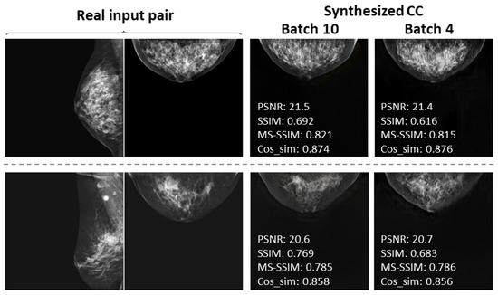 We also found, as can be seen from Table 3, that the similarity metrics slightly decreased (PSNR, MS-SSIM, and Cos_sim: p < 0.05) and the training time considerably lengthened as the batch size changed from 10 to 4 for 256 × 256 image synthesis. Figure 15 shows the real input mammograms and the respective synthesized CC views using batch sizes of 10 and 4 for two case examples. We frequently observed that, when using a batch size of 4 (and not only in these two cases), there were more notable artifacts in the synthesized views, such as stripe lines and texture distortion in the mammary gland. In spite of the slight decreases in the similarity metrics, the use of a smaller batch size clearly degraded the image quality.