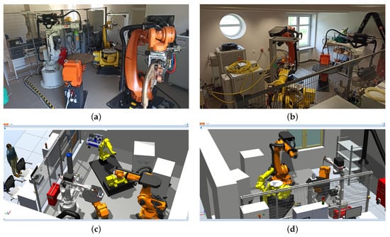 The design and commissioning of robotic production workstations is a complex issue and requires a great deal of effort on the part of engineers. In the past, this was carried out without the use of high-tech software environments (e.g., RobotStudio, RoboGuide, KUKA Sim), which usually caused delays in the deployment schedule of the workstations. The development of programming environments and hardware has meant that some tasks are implemented in virtual environments using digital twins. This allows the project to be implemented in a hybrid manner, where some activities are carried out online and some offline (also in virtual reality) [11,12]. The biggest advantage of such an approach is that it reduces the start-up time of the workstations, as a lot of work can be carried out in parallel (e.g.,: robot programming, workstation construction) [13]. Manufacturers of offline robot programming environments assure that simulations conducted in the environments are able to almost 100% replicate the real conditions of a robotic workstation. One of the most important advantages of the environments is the ability to easily generate motion trajectories, which allows the determination of production cycle times. However, it is worth noting here that it remains a problem to conduct analyses related to real accelerations, torques and forces acting on cooperating devices. A comprehensive picture of these quantities can only be obtained by conducting experimental studies. The use of triaxial IMUs makes it possible to measure the vibrations of the robot, these data allow analysis and optimization of the manipulator [14]. With the use of IMUs [15], it is possible to acquire data across the entire production.