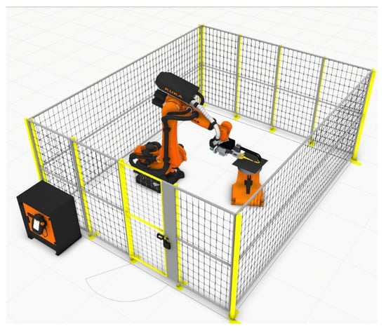 The components used and their layout correspond to the real stand (Figure 2) available at the Robotics Laboratory of the Military University of Technology (MUoT). The developed simulation in the KUKA.SIM Pro environment allows for planning the trajectory of the tool’s movement and plotting it using the tool’s position tracking option-Tool Center Point (TCP). According to the manufacturer’s declaration, the station, prepared on the basis of Digital Twin technology, reflects the operation of the real machine in 99%. As a result, it is a solution that speeds up the commissioning of the real station and helps to avoid potential collisions during robot operation. Figure 3 shows a general view of the test stand developed in the KUKA.SIM Pro environment. To improve visibility, components not used in this study have been hidden.