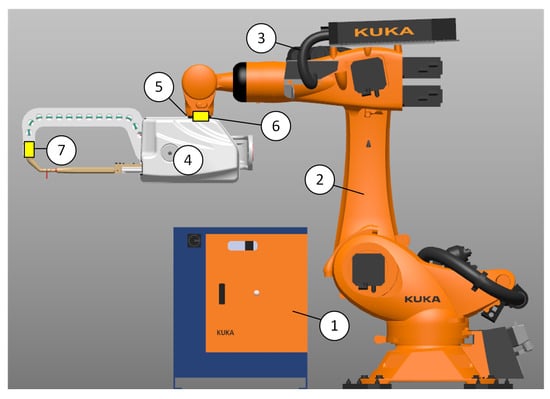 Elements of the test bench: 1—robot controller, 2—manipulator, 3—dress pack, 4—weld gun, 5—flange, 6—vMTi-680, 7—MTi-300.