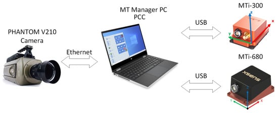 Connection diagram of the computer with sensors (MTi XSENS) and camera (PHANTOM V210).