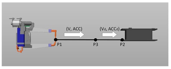 Robot approach to process point. P1—start point, P2—process point, P3—additional point, V-linear speed of the robot, ACC-acceleration coefficient, -modified linear speed of the robot, -modified acceleration coefficient.
