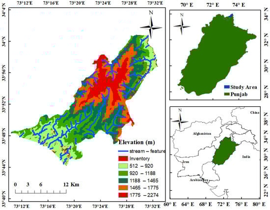 The present study was carried out in Pakistan’s Murree area. Murree is a well-known tourist destination and is an attractive hill station in Pakistan []. The Murree region is geographically located in the Rawalpindi district of Punjab at 33.9078 °N and 73.3915 °E at a height of roughly 3000 m above sea level, as shown in Figure 1. Geographically, the study area is located to the north and west of Haripur, KP. The Jhelum river is to the east, and the Kotli Satian is to the south of tehsil Murree []. It is a subtropical highland zone with annual precipitation of up to 1800 mm and a mean annual temperature of 12.7 °C []. The Murree area was created by the collision of two plates, the Indian and Eurasian plates, and is located on the southern edge of the Sub-Himalayan foothills. The research area is often regarded as the most elevated zone []. This region is largely inhabited by molasses deposits of sandstone and siltstone, which are impacted by tectonic activity of the Main Boundary Thrust (MBT) [].