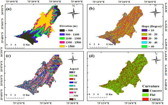 Figure 3. Topographic factors for soil erosion (a) elevation map (b) slope (c) aspect (d) curvature. - (ii)