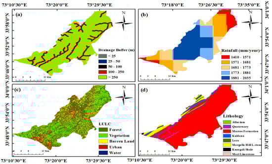 Figure 4. Soil erosion causative factors: (a) Drainage Buffer; (b) Rainfall; (c) LULC; (d) Lithology. - (vi)