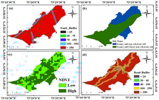 Figure 5. Soil erosion causative factors: (a) Fault; (b) Soil; (c) NDVI; (d) Road. - (x)