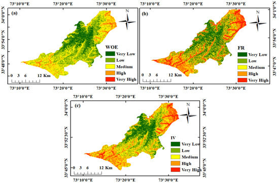 Final LSM of the study area: (a) LSM by WOE; (b) LSM by FR, and (c) LSM by IV.
