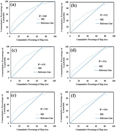 The AUC graph for the WOE model showed that the plotted values for SRC and PRC were 0.88 and 0.92, respectively. Figure 7a,b shows the SRC and PRC for the WOE model, whereas Figure 7c,d shows the SRC and PRC for the FR, which were 0.91 and 0.94, respectively. The SRC and PRC values for IV were 0.87 and 0.90, respectively. Figure 7e,f shows the AUC for the IV model.