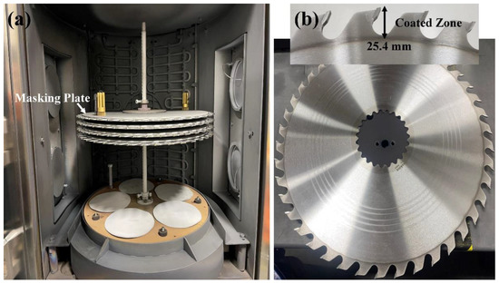 The disposition of the saws in the chamber of the PVD coating system and the deposition area are presented in Figure 2. The distance between the saws was 75 mm. Two masking plates were mounted on both sides of each saw to cover the steel bodies. The target area for coating deposition was a 25.4 mm ring extending from the tip of the carbide inserts toward the center of the saw. Therefore, the inserts and the outside rim of the saw along with the gullet area were coated.