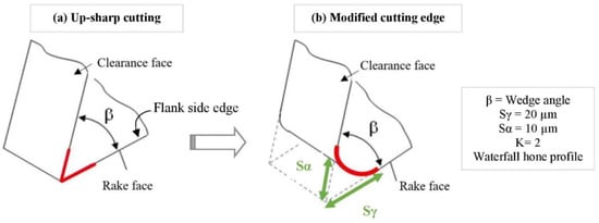 - Wang, W.; Saifullah, M.K.; Aßmuth, R.; Biermann, D.; Arif, A.F.M.; Veldhuis, S.C. Effect of Edge Preparation Technologies on Cutting Edge Properties and Tool Performance. Int. J. Adv. Manuf. Technol. 2020, 106, 1823–1838. [Google Scholar] [CrossRef]