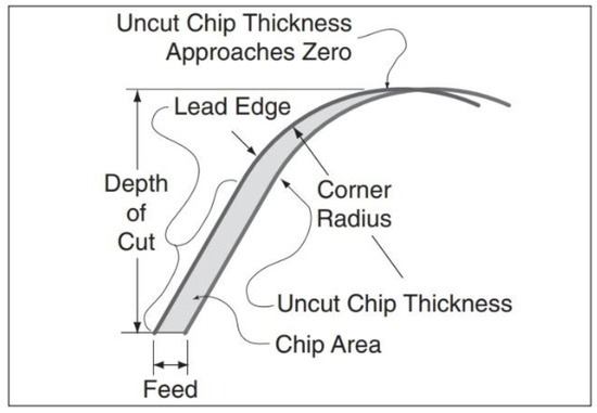 It is well established that the thickness of the uncut chip changes from a maximum, which is equal to the feed per tooth, to a negligible amount on the tool’s corner radius according to Figure 4 [5]. In other words, the ratio of uncut chip thickness to the edge radius varies along the corner radius. In the cutting process, the ultimate goal is to keep the material removal process as efficient as possible [5]. As a result, the size of edge preparation must change along the corner radius.
