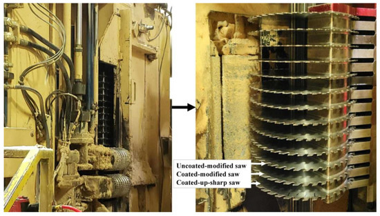 The industrial wood cutting tests lasted for three periods of 480 min. The first phase involved utilizing saws 1, 3, and 5 under industrial conditions for 480 min of sawing. The saws were mounted on the vertical arbor of the bull-edger system (USNR VSS), as shown in Figure 5. The rotational speed of the saws and the resulting cutting speed were 2600 rpm and 83 × 103 mm/s, respectively. The feed speed was 3050 mm/s for studs with a depth of 101.6 and 76.6 mm. For studs with a depth of 152.4 mm, the average feed speed was 2417 mm/s. Therefore, the feed per tooth was 1.67 and 1.33 mm, respectively.