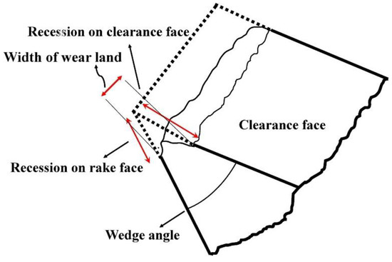 Upon completing the test, tips from each saw were randomly selected and extracted to characterize their wear in scanning electron microscopy. The primary cutting edge, rake and clearance faces of each tip were analyzed. The second phase of the test included using saws 2, 4, and 6 for a sawing period of 480 min. Upon completion, the wear of the tips was characterized using a Reichert Jung 580 optical microscope. The images acquired were analyzed using the Image J 1.53e image analysis software. The analysis included determining the wear of the tips according to the parameters shown in Figure 6 [25]. The wear indexes were the change in recession on the rake and clearance faces and width of the wear land.