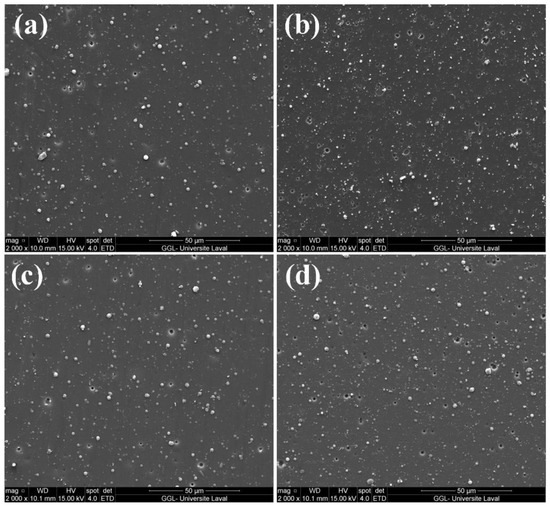 Figure 7 presents the typical surface morphology of the coatings studied. Spherical and shapeless microdroplets and macrodroplets can be observed on all the coatings, which are common features of cathodic arc vapor deposition [26,27]. Moreover, the voids can be seen on the coated surfaces correspond to sites where droplets were pulled out. The presence of such features and their origin is also reported in [28,29]. The number of droplets per unit area (n/mm2) was analyzed by the software Image J 1.53e [30]. For CrN/CrCN/DLC, CrN/AlTiN, CrN/CrCN and CrCN/TiSiCN coating, the number of droplets per unit area were 53,105, 115,105, 68,421, and 113,895, respectively. Therefore, the CrN/CrCN/DLC and CrN/CrCN coatings presented smoother surfaces compared to the CrCN/TiSiCN and CrN/AlTiN coatings. It was reported that the arithmetic roughness of the surface plays an important role on tribological properties [14,31].