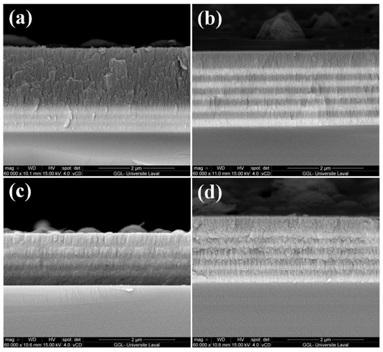 SEM micrographs illustrating the fracture cross-section views of as-deposited coating on silicon wafer substrates (a) CrN/CrCN/DLC, (b) CrN/AlTiN, (c) CrN/CrCN, and (d) CrCN/TiSiCN.