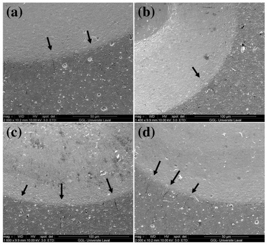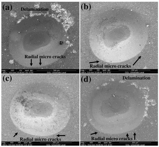 SEM micrographs at higher magnification of the specimens used to carry out the Daimler–Benz adhesion tests clearly show the presence of radial micro cracks around the imprint of the tested coatings (Figure 10).