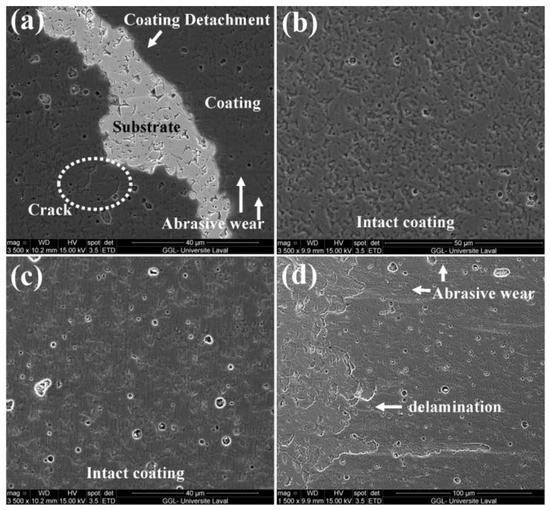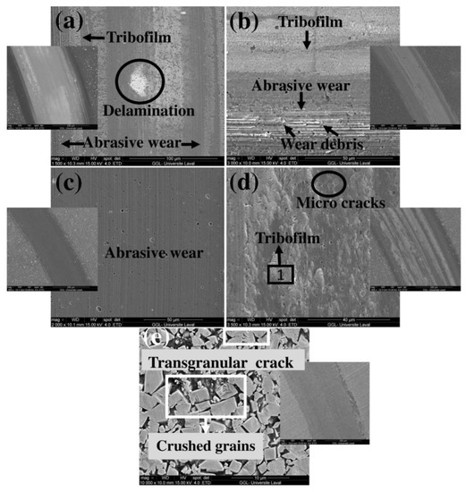 Figure 17 shows SEM micrographs of typical worn surfaces of different coatings and uncoated WC-Co substrates at the sliding speed of 100 mm/s. The dominant wear mechanisms for CrN/CrCN/DLC coating were delamination and abrasive wear. As seen in Figure 17a, the coating is rubbed off from the surface, mostly in the middle section of the wear track. The detached coating particles may also serve as abrasive particles increasing the wear rate through the development of three-body abrasion mechanism. Mild adhesive wear was also observed. Oxide layers formed during the test were present within the wear track (Figure 17a).