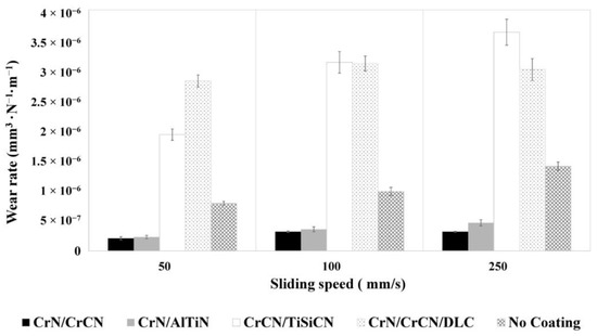 It is well established that the addition of carbon to the CrN system reduces the residual stress and friction coefficient. It also increases wear resistance as well as the adhesion of the coating to the substrate [35]. Moreover, CrN/TiAlN coating increased the wear resistance of the WC-Co substrate. As stated by Gao et al. [36], higher wear resistance of hard films is associated with higher hardness. According to the results presented in Figure 13, the CrN/CrCN coating significantly decreased the wear rate of WC-Co substrates by 74%, 66% and 77% at sliding speeds of 50, 100 and 250 mm/s, respectively.