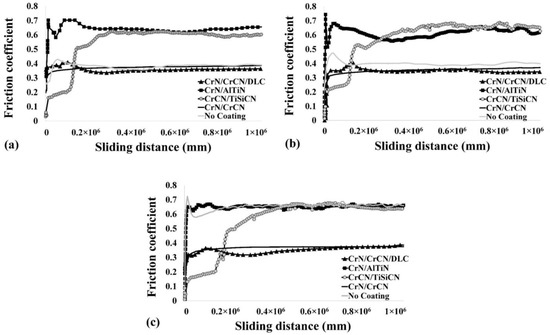 Variation of friction coefficient in terms of sliding distance at sliding speed of (a) 50 mm/s, (b) 100 mm/s, and (c) 250 mm/s.