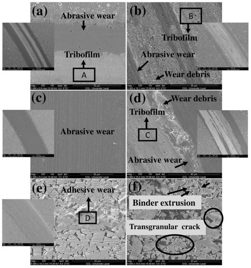 SEM micrographs of the wear track surface of different coatings at the sliding speed of 50 mm/s (a) CrN/CrCN/DLC, (b) CrN/AlTiN, (c) CrN/CrCN, (d) CrCN/TiSiCN, and (e,f) uncoated WC-Co substrate.