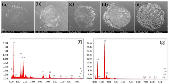 The dry sliding wear test was carried out using a pin-on-disk instrument (Tribometer TRB3, Anton-Paar, Graz, Austria) according to ASTM standard G99. A ball made of Al2O3 and having a diameter of 6 mm was used as a counter body. The tests were conducted using a constant normal load of 10 N and a sliding distance of 106 mm. The selected sliding speeds were 50 mm/s, 100 mm/s and 250 mm/s. Tests were conducted at 24 °C and 65% of relative humidity. A Surtronic S-100 Series surface profiler was used to measure the depth and width of the wear tracks at ten different locations in order to calculate wear rates. The morphology and composition of the worn surfaces, i.e., coated samples and alumina balls were characterized in Scanning Electron Microscopy equipped with an Energy-Dispersive X-ray Spectrometer. Three-body abrasion tests were performed according to ASTM standard G65 (procedure C), which is defined specifically for the use on thin coatings. The abrasive body was silica sand AFS 50/70. The sand flow rate, the applied force, and the wheel revolution were 330 g/min, 130 N, and 100, respectively. The latter parameters resulted in a lineal abrasion of 71,800 mm. The wear rate of each tested specimen was calculated as shown in Equation (1) [22].