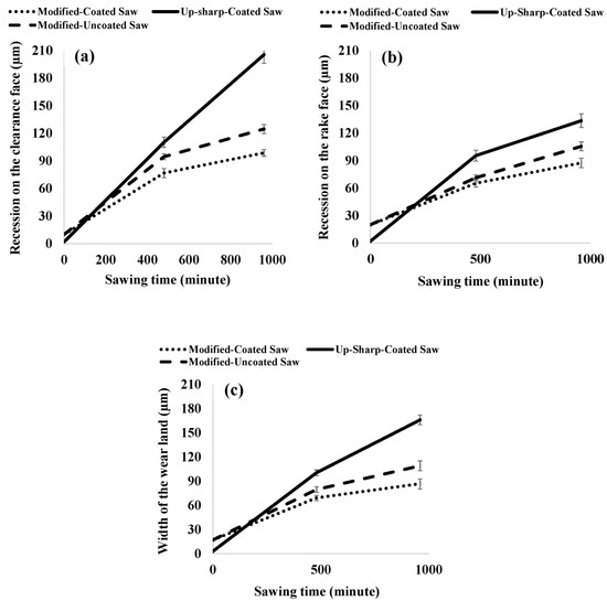 Abrasion took place on a small area at the corner of the tips of the uncoated saw that had undergone edge modification, as presented in Figure 27f. The corners of the tips of the coated saw with edge modification remained intact and no breakage and abrasion wear took place (Figure 27a,d). Coating on the sides of the saws had the potential to reduce the detrimental build-up of heat during sawing, thus helping to prevent abrasion on the clearance face. Reduction of wear on the corner of tips effectively increases the cutting capabilities of the saw. In a study conducted by Benlatreche [59], edge honing of WC-Co inserts improved tool wear resistance during machining MDF, especially when it was combined with the application of CrVN and CrAlN coatings.