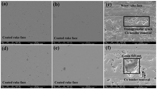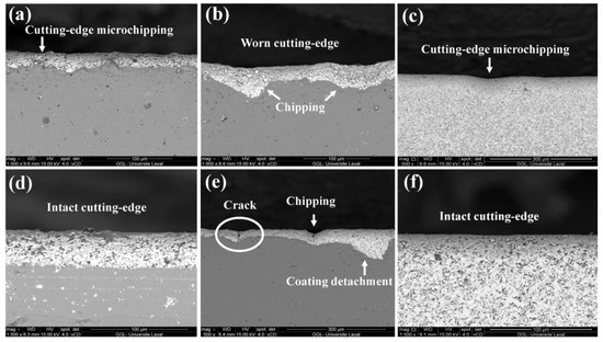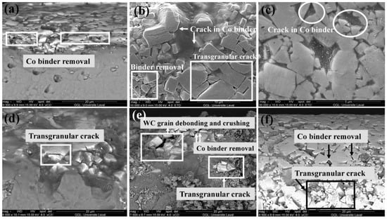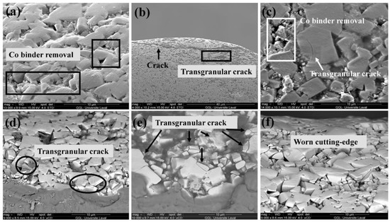 SEM micrographs of the worn cutting edge from the clearance face view at higher magnification are presented in Figure 28. Transgranular cracks in a few WC grains and partial extrusion of the cobalt binder were observed on the cutting edge of the saws having variable edges preparation (Figure 28a,c,d). The grainy structure of the worn cutting edge of saw #6 (Figure 28f) showed that the latter lost most of its interconnecting cobalt binder after 960 min of sawing. The coated saw with up-sharp tips sustained a crack parallel to the cutting edge that is the product of impact wear, as seen in Figure 28b. The cutting edge could no longer support the cutting forces as efficiently, resulting in chipping. As explained earlier, this condition promotes an increase in the ploughing area in front of the tip. As a result, additional frictional heat is generated, assisting in binder removal, transgranular crack in WC grains in all directions, and fragmented grains (Figure 28b,e). It should be pointed out that the coating was fully removed from the up-sharp cutting edge. Therefore, the coating could no longer assist in the protection of the cutting edge from the aforementioned failures.