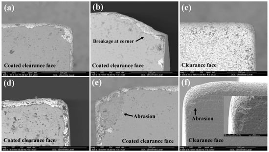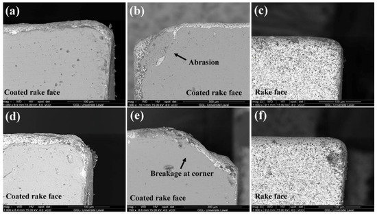 Typical SEM micrographs (from the clearance face view) of the corners of all saws used during 480 and 960 min of sawing are shown in Figure 27. Apart from breakage (Figure 27b), some of the tips of the coated saw with up-sharp cutting edge geometry suffered from abrasion wear (Figure 27e). The latter is due to the degradation of cutting edges, leading to larger contact length between the clearance faces and the wood. As a result, the level of frictional heat was concentrated in this area. Moreover, frictional heat developed from side rubbing on the spring back layer of the wood is another source of heat affecting the abrasion wear mechanism. As seen in Figure 27e, the coating was partially delaminated from the abraded area. No breakage or chipping was observed at the corners of edge-modified tips as a result of corner strengthening by the honing process (Figure 27a,d,c,f).