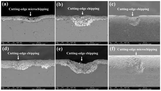 SEM micrographs of the defects on the cutting edges (rake face view): (a–c) saws #2, 4, and 6, respectively after 480 min of sawing and (d–f) saws #2, 4, and 6, respectively after 960 min of sawing.