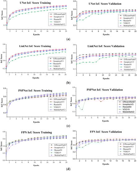 Jaccard Index (IoU Score) value for training and validation datasets for four Segmentation Models with different backbones. (a) U-Net; (b) Linknet; (c) PSPNet; and (d) FPN.