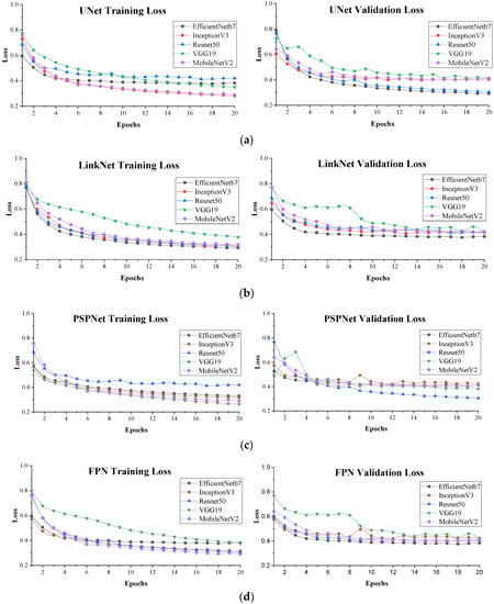 The categorical focal dice loss function for training and validation datasets for four Segmentation Models with different backbones. (a) U-Net; (b) LinkNet; (c) PSPNet; and (d) FPN.