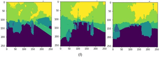 The most frequently used evaluation metrics to compute the performance of segmentation models are Mean Intersection over Union (mIoU) and F1 score, as represented in Equations (5) and (6), respectively. Intersection over Union (IoU), also known as Jaccard Index, is a very effective and straightforward metric for segmentation. The IoU value is obtained by dividing the overlap area by the union area between the predicted segmentation and the ground truth [25]. The IoU value for “” different class labels in this work is obtained by Equation (4), and the definitions for TP, FP, and FN are given in Table 3.