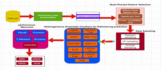 This section describes the multi-phased process for refactoring prediction at the class level and considers the overall research goal. The prime intention is to design a novel and robust automatic refactoring detection and classification system. This research incorporates a multi-phased optimization measure, focusing on enhancing all key functional components, including pre-processing and data augmentation, feature extraction, and feature selection, followed by ensemble-assisted classification. Distinct from conventional research, different authors have merely focused on applying classical classification algorithms such as Naïve Bayes, SVM, or ANN to perform classification over limited code metrics. We exploit the software program’s major possible structural artifacts to assess its significance in characterizing refactoring proneness. Observing the significant existing literature and their inferences where it has been found that code bug-proneness or smell directly relates to refactoring probability, we consider this trait (i.e., code-smell) as a refactoring signifier to perform (refactoring) classification.