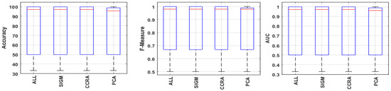 Accuracy, F-Measure, and AUC Performance over different feature selection techniques.