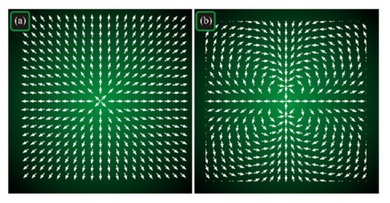It is seen in Figure 1 that on a closed contour around the field, the polarization vector makes one full rotation in Figure 1a and three full rotations in Figure 1b. Thus, on space propagation and in the focus, the field in Figure 1a (n = 1) should retain its rotational symmetry, whereas 3rd-order cylindrical polarization (n = 3, Figure 1b) violates this rotational symmetry.
